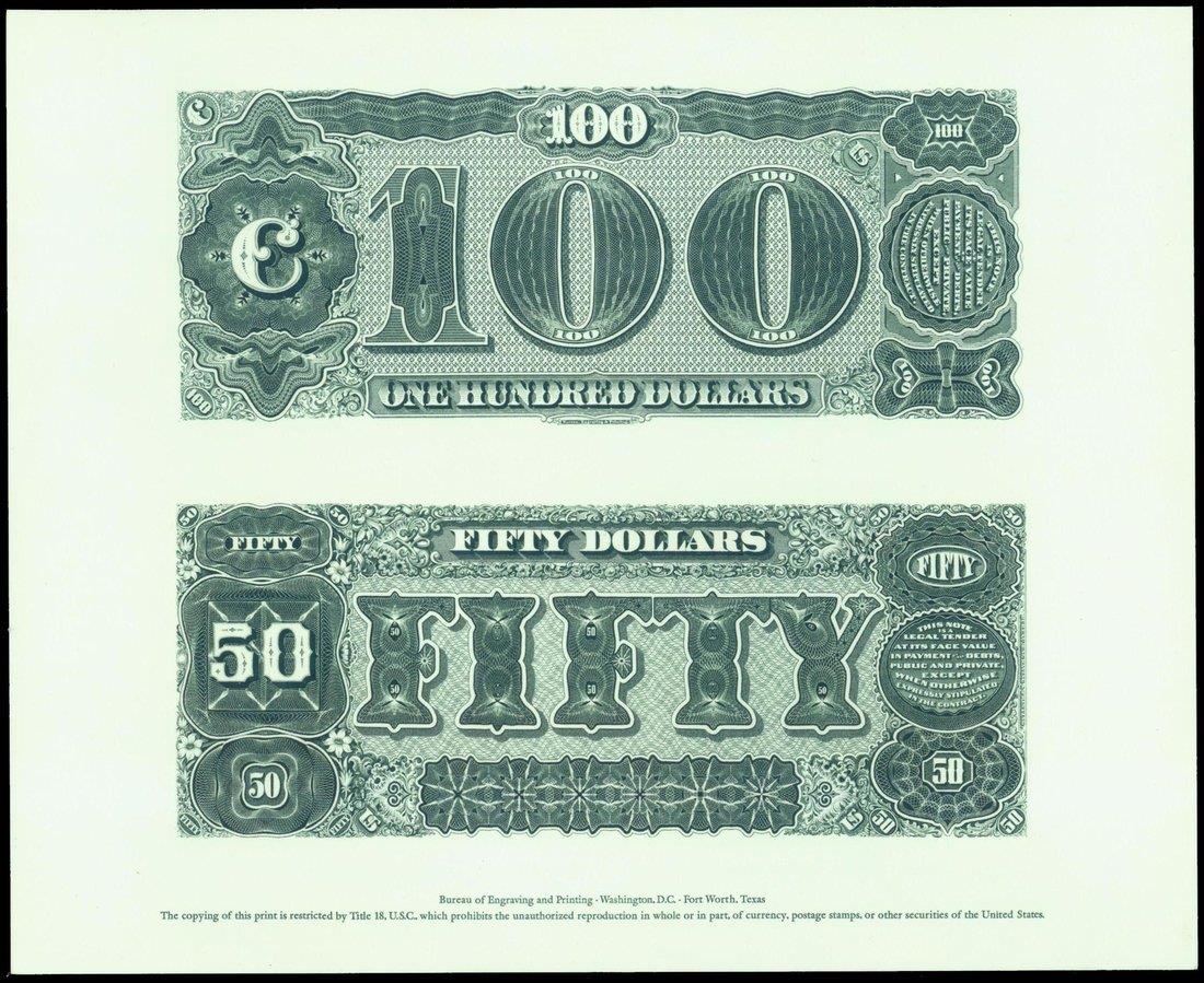 United States, uniface reverse of a $50 and $100, reprint from the American Numismatic Association,