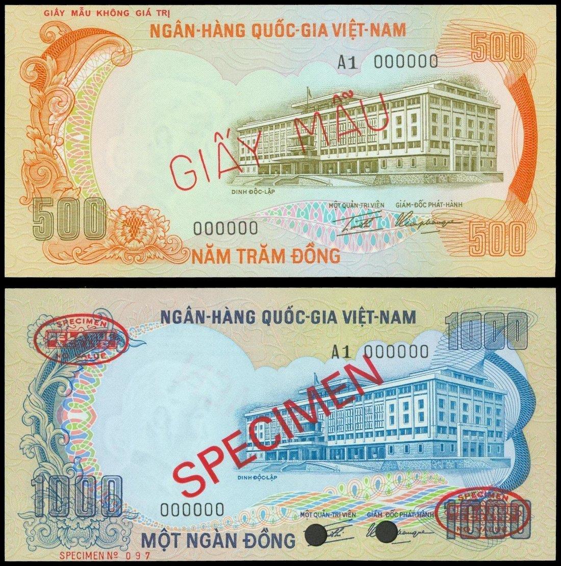 South Vietnam, lot of 2x specimens, for 500 dong and 1000 dong, no date (1972), orange and blue respectively, the 500 dong features and tiger on the reverse whilst the 1000 dong features three elephants,