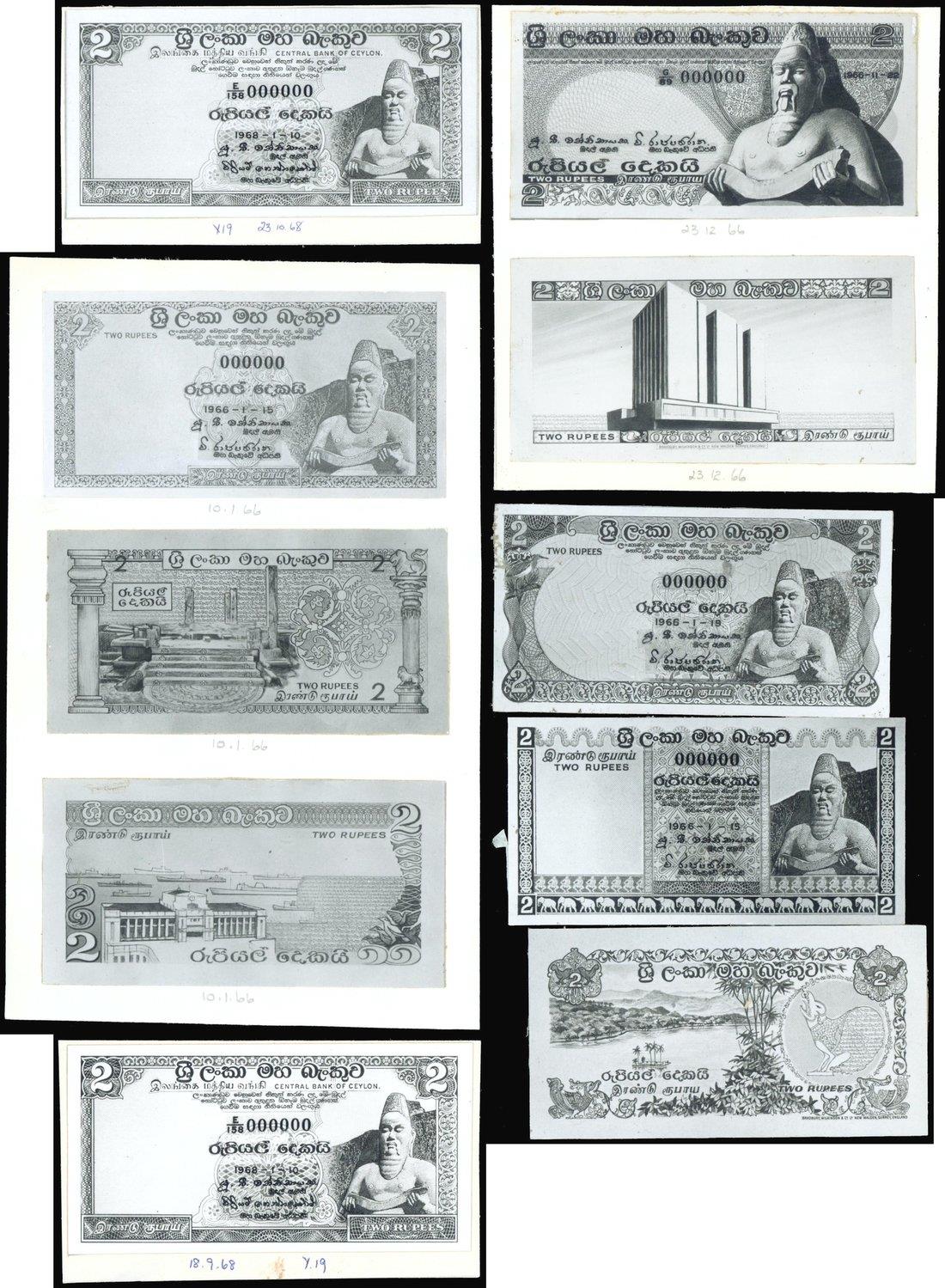 Parakkrama’ series, c.1966 to 1968, on the casual glance similar to the ones issued but on closer inspection these proofs have different vignettes, borders and angles of the statue, the reverses are noticeably different, featuring modern buildings, riverside scenes compared to pavilion ruins on the issued note (Pick not listed),