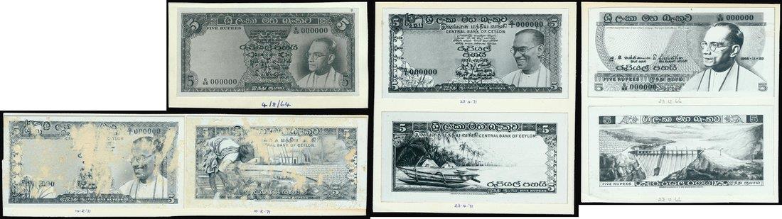 photographic proofs for 5 rupees, the ‘Solomon Bandaranaike’ series, c.1966 to 1971, on the casual glance similar to the ones issued but on closer inspection these proofs have different vignettes,