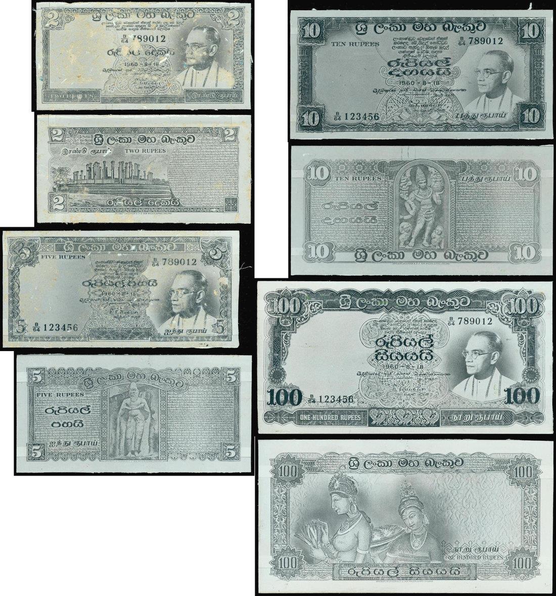 Central Bank of Ceylon, a group of archival photographic proofs for 2, 5, 10 and 100 rupees, the ‘Solomon Bandaranaike’ series, c.1960, similar to the issued notes, (Pick 62, 63, 64 and 66),