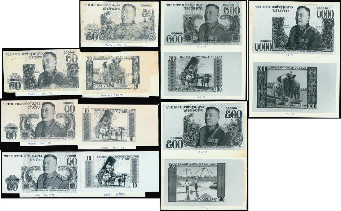Kingdom of Laos, a set of archival photographic proofs consisting of 10, 20, 50, 200, 500 and 1000 kip, c.1973, all are unissued designs, on a casual glance they are very similar to the issued notes but the obverse vignettes and the reverse designs are very different, (Pick not listed),