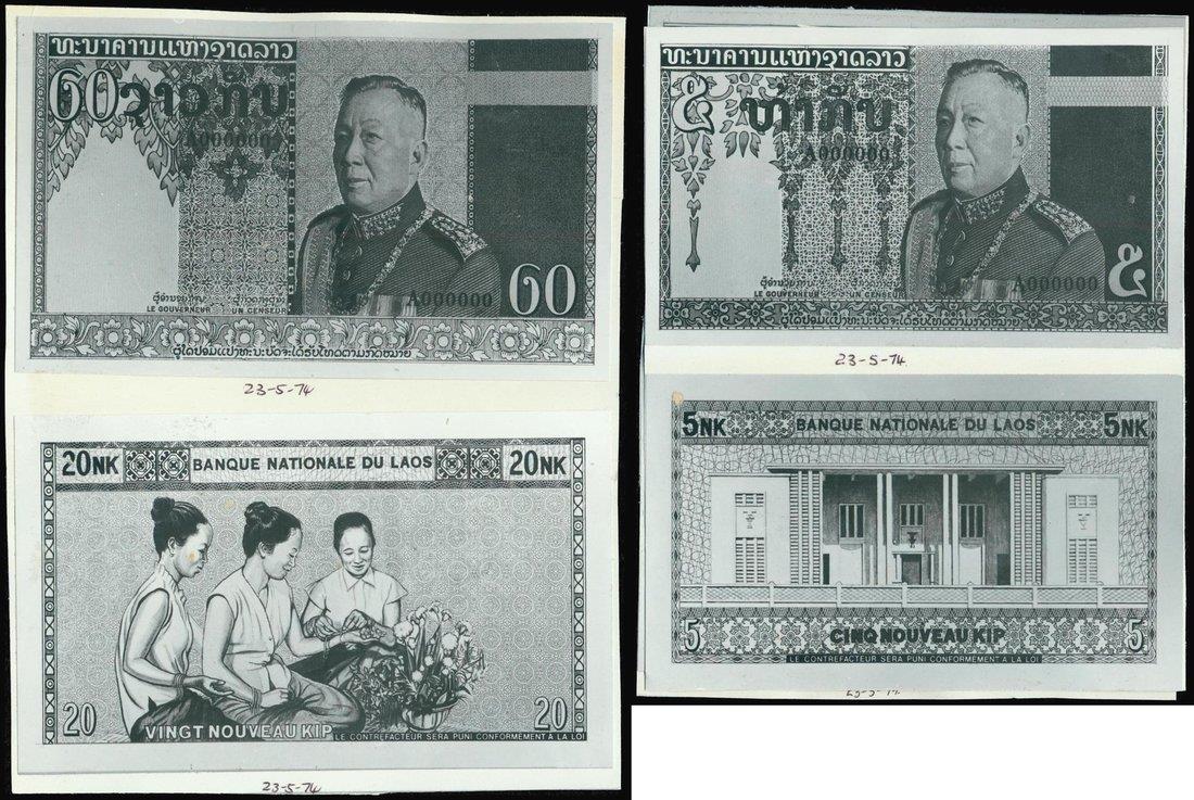 Kingdom of Laos, a set of archival photographic proofs consisting of 5, 10 and 20 noveau kip, c.1974, all are unissued design and the unit of currency unseen before, featuring King Savang on the obverse, the reverse designs have not been used on any issued notes, (Pick not listed),
