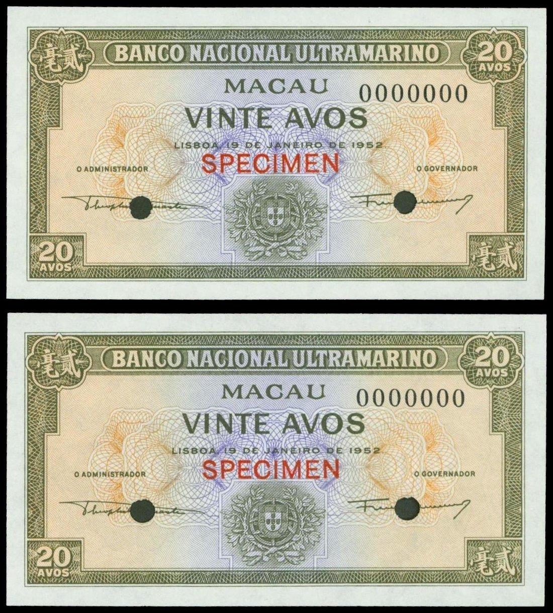 Macau, lot of 2 specimens for 20 avos, 1952, serial number 0000000, olive on orange and multicolour, hole punch cancelled, 'SPECIMEN' overprinted in red, reverse brown, ship seal at centre,