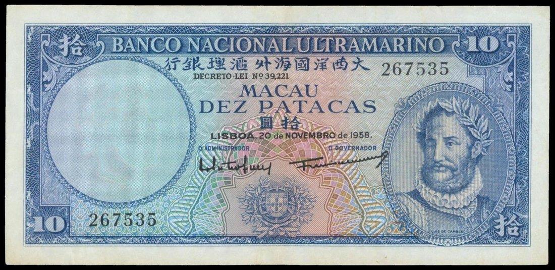 Banco Nacional Ultramarino,10 patacas, 1958, serial number 267535,blue and multicolour underprint, Camoes at right, watermark at left, arms at bottom centre, reverse blue on pink, maiden watching ships at centre,