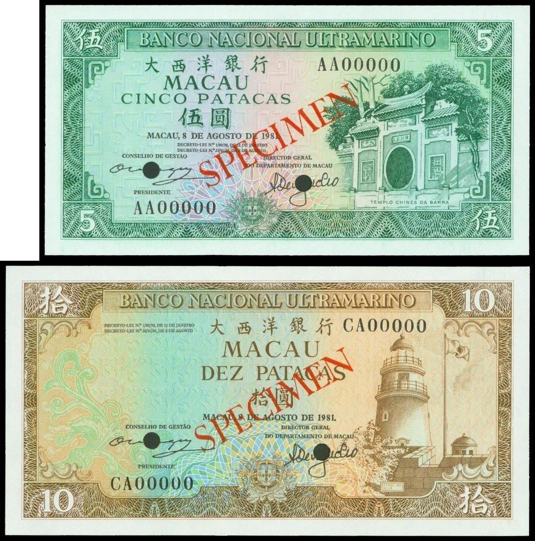 Macau, lot of 2 specimens, 5 and 10 patacas, 1981, green and brown respectively, featuring a Chinese temple and a lighthouse,