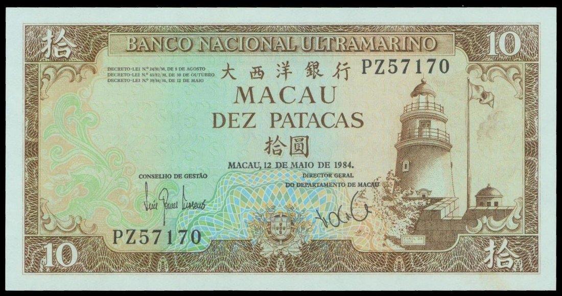 Macau, silver 1 patacas, 1952 and 10 patacas of Banco Nacional Ultramarino, 1984, serial number PZ57170,