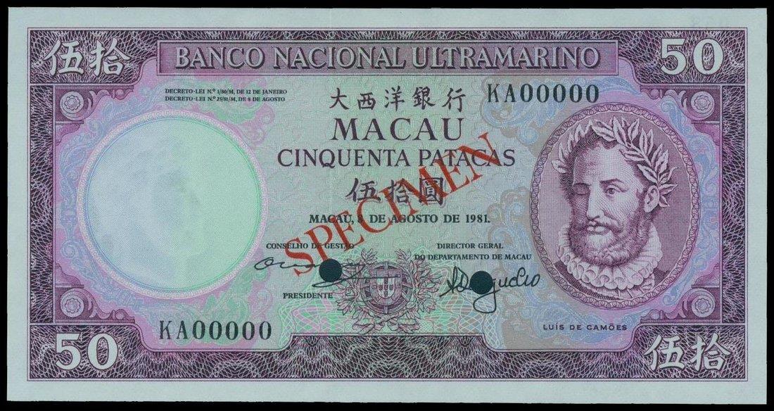 Macau, Banco Nacional Ultramarino, 50 patacas, specimen, 8.8.1981, purple, green and multicolour, de Camoes at right,