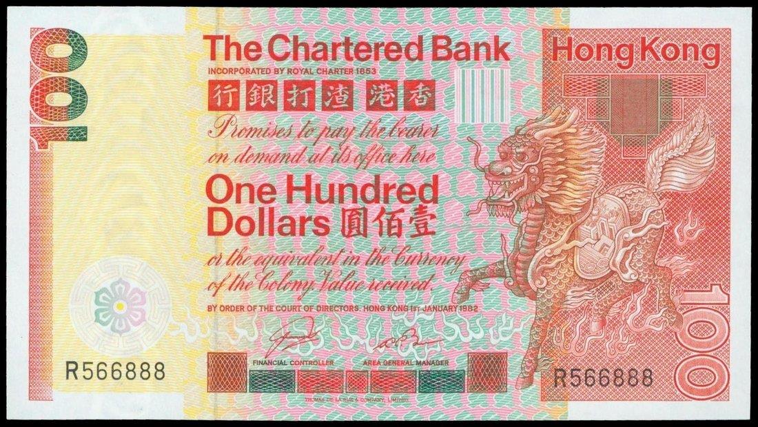 The Chartered Bank, $100, 1.1.1982, serial number R566888, red and yellow on multicoloured, Qilin at right, watermark of helmeted warrior at left, reverse red and green, coat of arms at centre, bank building at left,