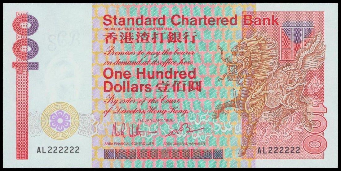 Standard Chartered Bank, $100, 1.1.1986, serial number AL222222, red and multicolour, Qilin at right, watermark of helmeted warrior at left, reverse red and green, coat of arms at centre, bank building at left,