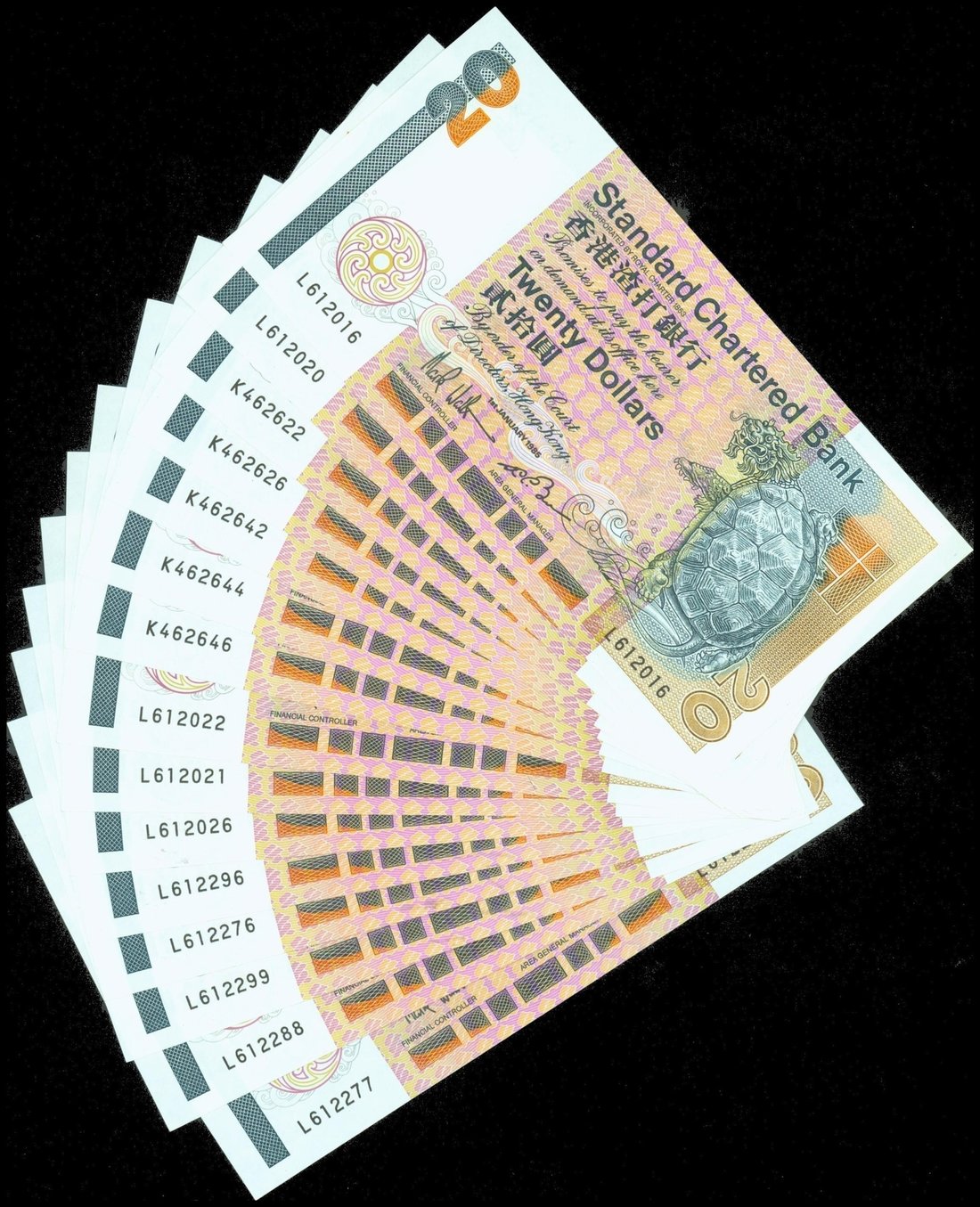 Standard Chartered Bank, a lot of 15 x $20, 1985, prefix L and K, gray blue on orange and multicolour underprint, mythical tortoise at right,