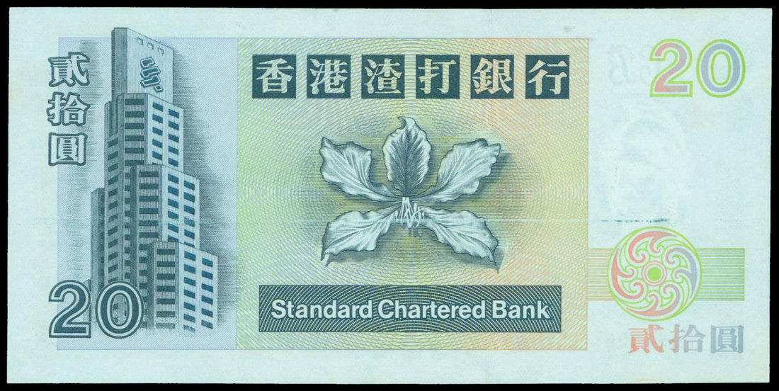 Standard Chartered Bank, $20, 1st January 1994, serial number F961006, dark gray, orange and brown on multicolour underprint, mythological tortoise at right, reverse gray-blue on multicolour underprint, with minor printing error at centre,