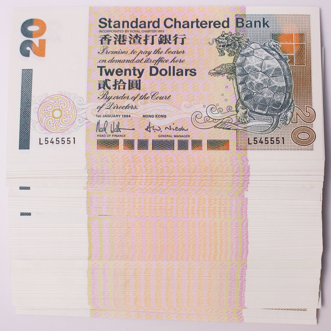Standard Chartered Bank, a lot of $20, 1994-1997, face value about $2400, blue-gray and orange, mythical tortoise at right,