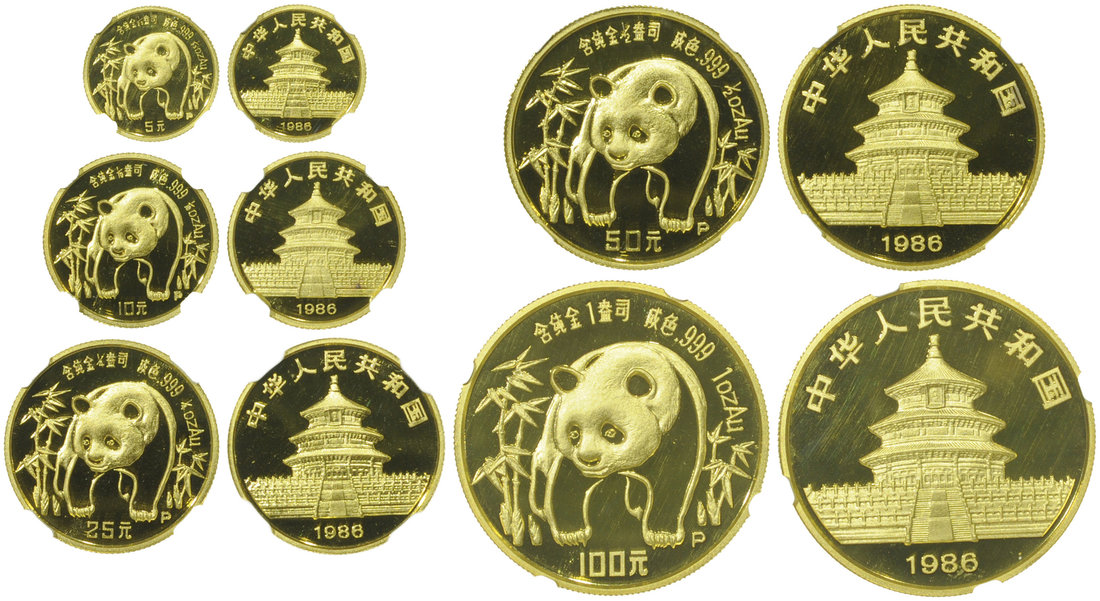 China, a set of gold panda coins, consisting 5, 10, 25, 50 and 100 yuan, 1986P,