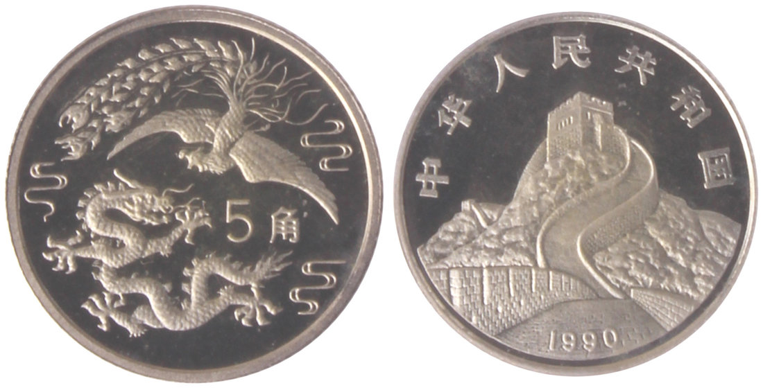 China, silver 5 yuan, 1990, 'Dragon and Phoenix',