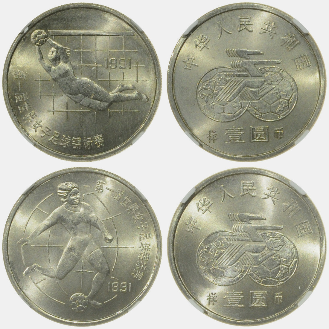 China, 2 x nickel 1 yuan, 1991, women's football, specimen,