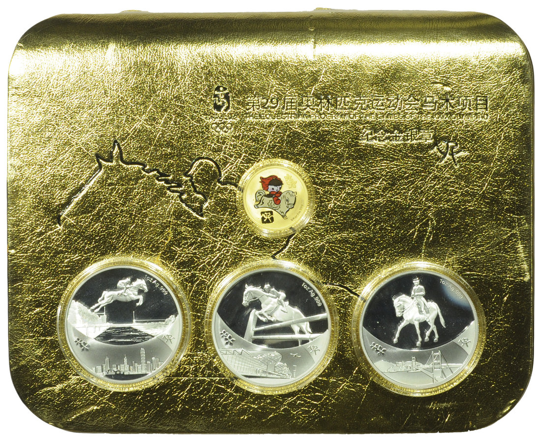 People's Republic of China, a set of 4 proof medals commemorating the 2008 Olympics in Beijing, containing 1/4 oz gold medal and 3x 1oz silver medals, issued by China Great Wall Coins,