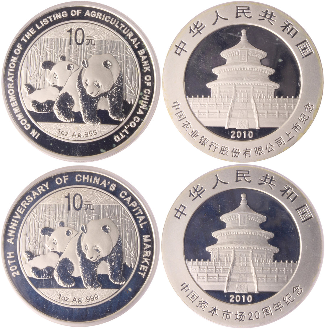 China, a pair of silver Panda dollar, 10 yuan, 2010, 20th Anniversary of China's Capital Market,
