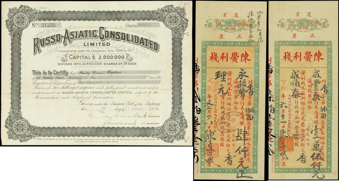 China, Russia, Lot of transfer receipts and share certificate, Tan Huang Lee Chan; two transfer receipts (1910-1920s), Russo Asiatic Consolidated; share certificate for 2/6d shares (1934),