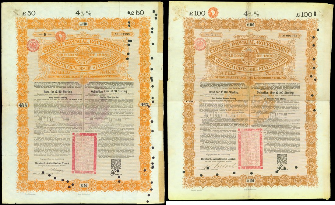 1898 Chinese Imperial Railway 5% Gold Loan, ?50 and 100, issued by Deutsch-Asiatische Bank, punch holes cancelled, with coupons,