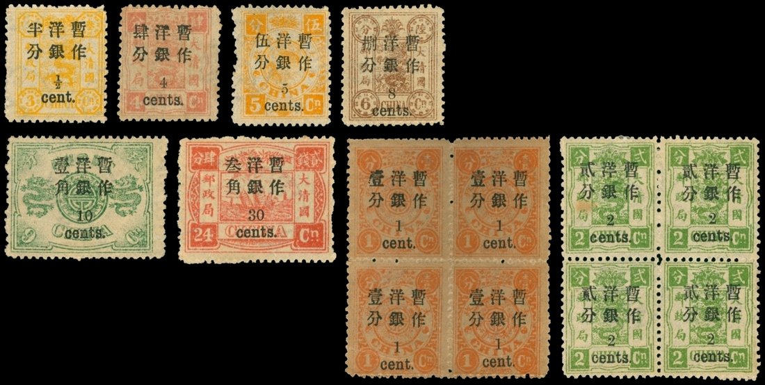 Complete set of eight, all showing 4mm spacing including 1c. on 1ca. and 2c. on 2ca., both are block of four, very fine mint with original gum.