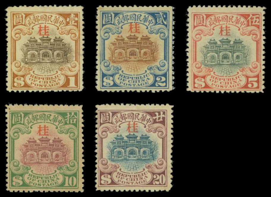 1923 $1 to $20 set of five overprinted kwei in red, unused ($1) to part original gum; $1 creased, $1 with two tone spots. Chan KS1-5