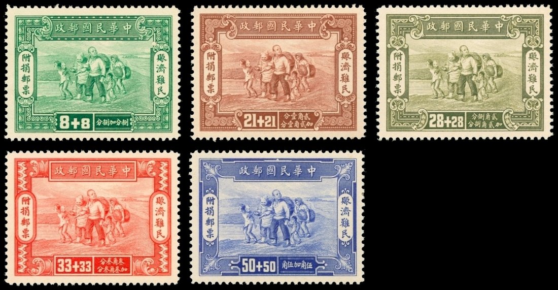 1944 War Refugees Relief Fund 8c+8c to 50c+50c, five values all with surcharge omitted variety, very light hinged, mint. Chan 815a-819a.