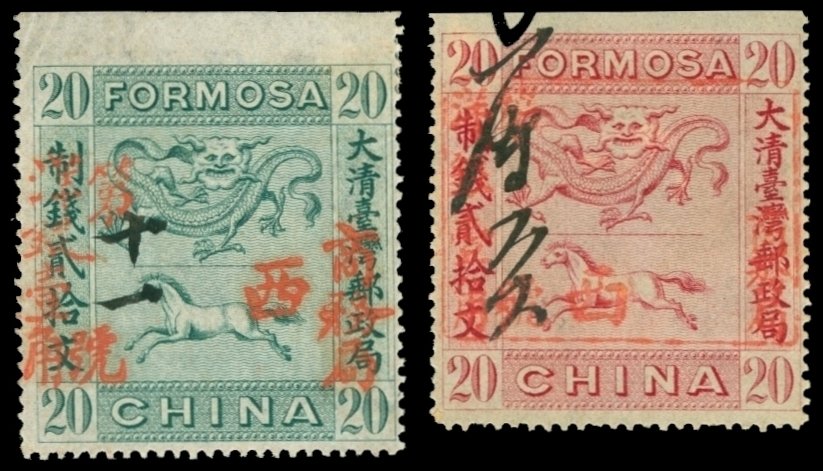 Handstamped unframed 'Commercial Bureau West' surcharged in red 10c. on 20 cash, green, and handstamped framed 'Commercial Bureau West' surcharged in red 10c. on 20 cash, red, bothe with imperf. top margin, deep bright colour, clear sharp impression of surcharge, much original gum, very fine. Chan F10, F23.