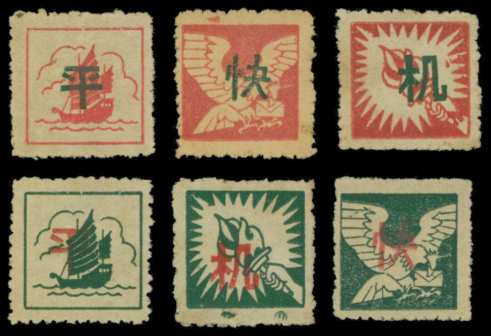 1942 First Issue: The set of six ,three in green with red overprint and three in red with green overprint, unused; a fine set, the torch showing printing marks in the lower margin. Yang EC252-257