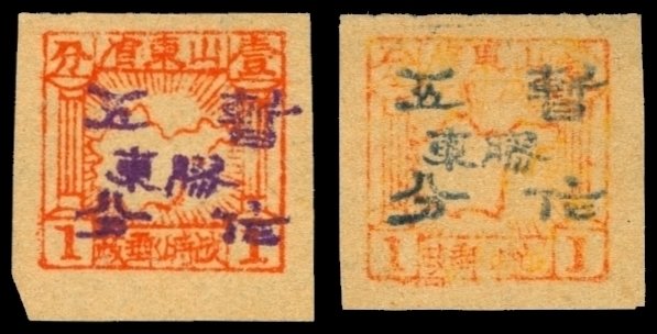 Handsurch, with character 'Chiao-dong' on Shantung 2nd war time post and new value, EC162a and b, unused.