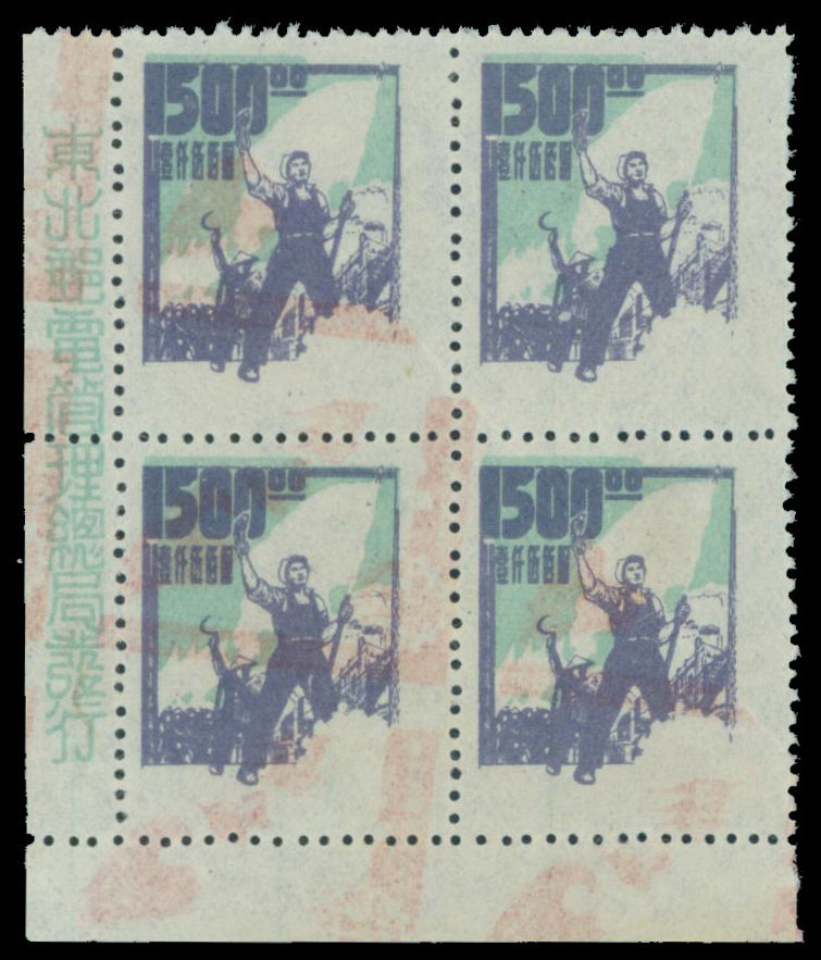 1949 Anniversary of Chinese Communist Party $1500 variety rose omitted and printed on the reverse in a lower left corner block of four; unused without gum as issued. There is a diagonal crease which was the cause of the red colour being printed at an angle on the reverse. An interesting and dramatic error. Yang NE148 var.