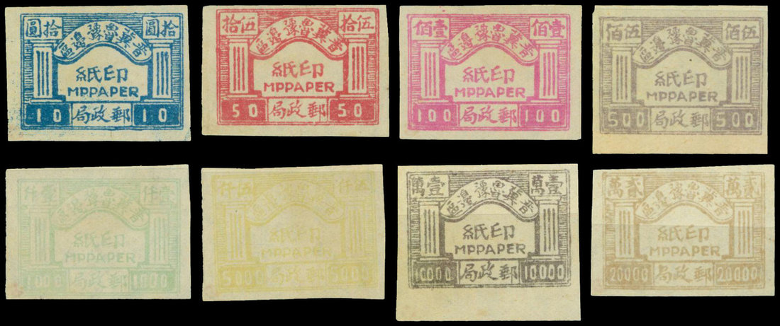 Shansi-Hopei-Shantung-Honan Border Area: 1946 $10 to $20,000 set of eight, unused without gum; each with small dealer's handstamp on reverse. A good set. Yang NCM17-24