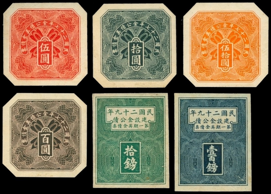 1938 US dollar Bond Stamps $5, $10, $50 and $100, and 1940 English pound Bond Stamps 10 pound and 100 pound, all imperf., very unusual item.