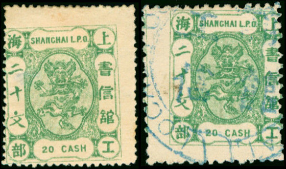 1885-86 20ca. green, mint and used, both with misperf. variety.
