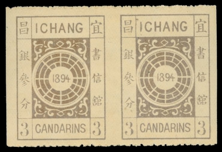 1895 Ichang Local Post 3c. unused pair, vertical imperf variety.