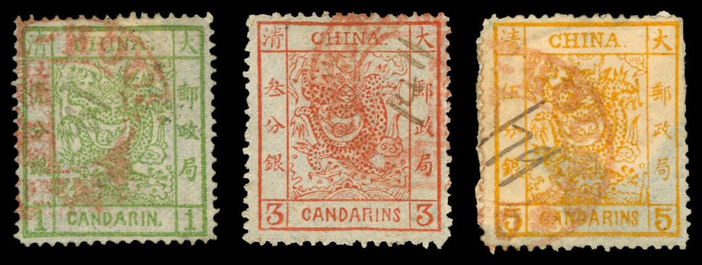 1ca. to 5ca., thin paper, complete set of three, all cancelled red 'CUSTOM-HOUSE WUHU' date by hand writing, very rare, only recorded in set. Chan 1-3.