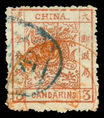 3ca. thick paper rough perf. cancelled by blue seal chop and red arrival c.d.s. Chan 11.