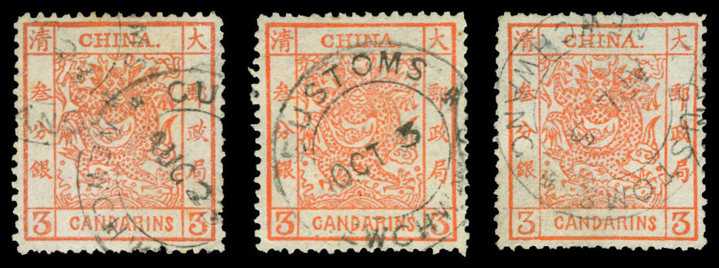 3ca. thin and thick paper, 12 stamps all cancelled 'CUSTOMS NEWCHWANG' no year type twelve months, few stamps with small thin, still not easy to collect whole year cancellation. Chan 2, 9.