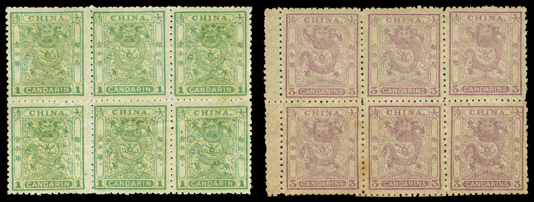1885 clean cut perf. 12½, 1ca. bright green, block of six, unused, no gum, few light wrinkles, fresh colour and 3ca. mauve, block of six with left gutter margin, mint, toned gum, very rare mutliple block for this issue, seldom to offered. Chan 13, 14.