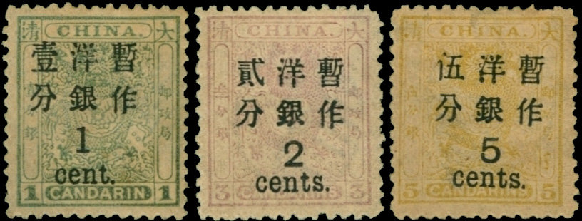 1c. on 1ca. to 5c. 5ca., set of three, mint with large part of original, hinged, very fine. Chan 34, 36.