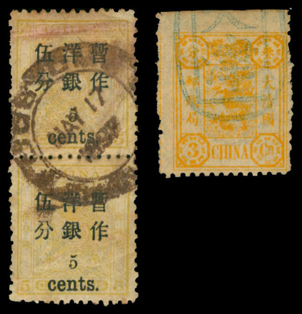 3ca./ top margin imperf. variety used with 'Tientsin' blue seal chop, small Dragon 3c. on 5ca. vertical pair, used. Chan 24, 33.