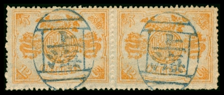 12ca. brown orange, horizontal pair, used with full 'Shanghai' seal chop cancelled, very fine. Chan 29.