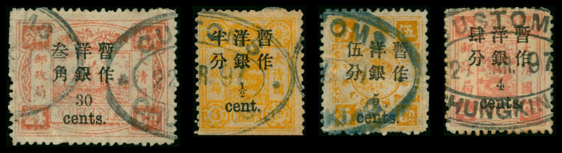 ½c., 4c., 5c., 30c., all used with blue oval 'CUSTOMS CHUNGKING' c.d.s., ½c. lower trimmed perf., others very fine. Chan 37, 40, 41, 46.
