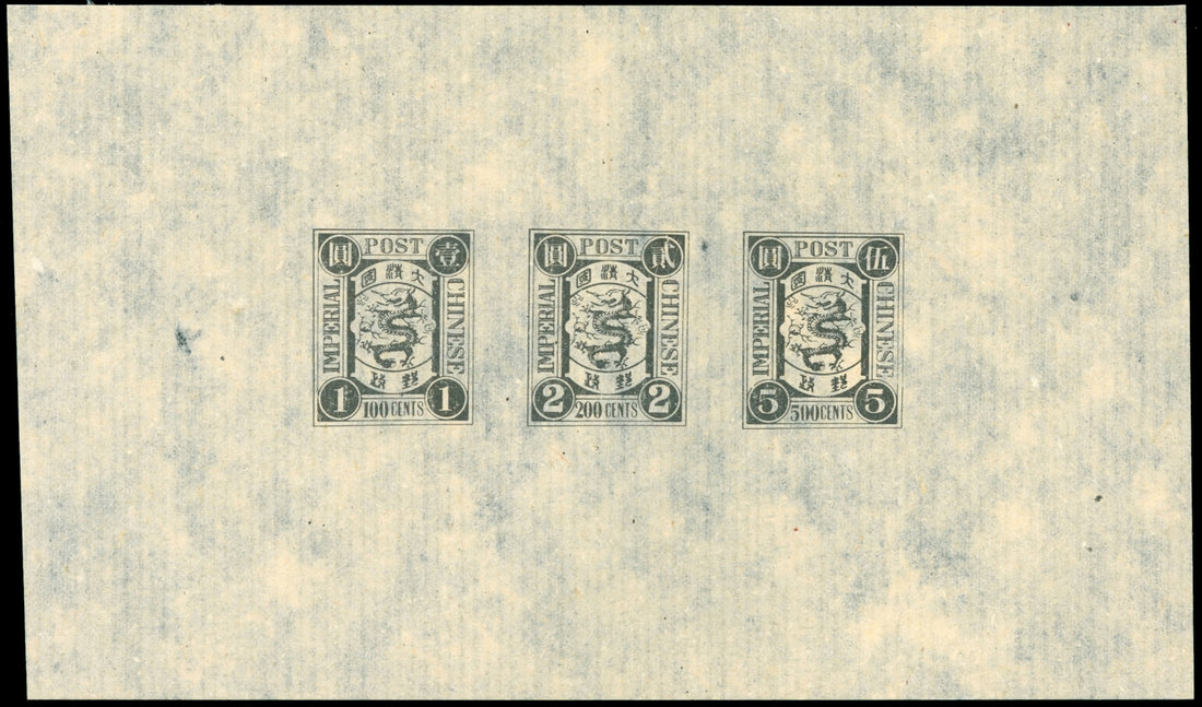 1897 Essay of Coil Dragon (2) (The dragon is thicker and the abdomen is not white, the cloud is dense) $1, $2, $5 printed on vertical laid paper, unusual item. (The Essays of Early China, Edited by S. H. Chan 1996 page 50).