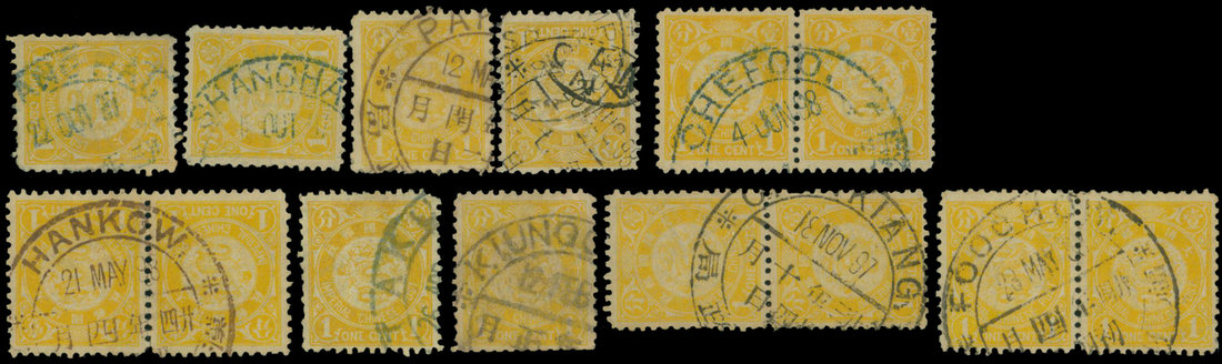 1c. 4 pairs and 6 single stamps, used with nice dollar chop, very fine.