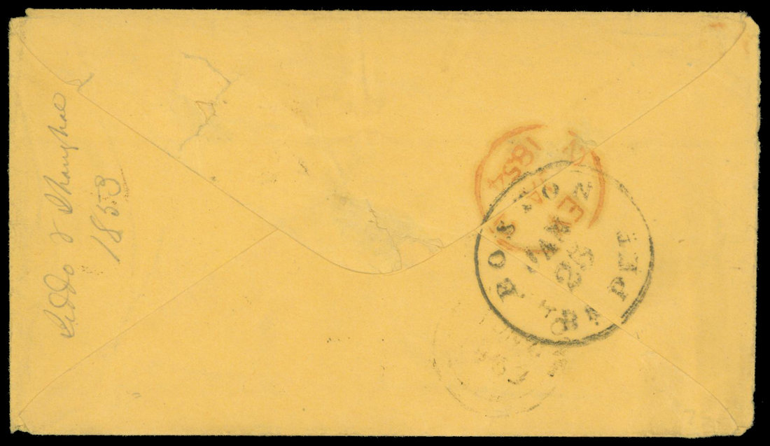 1853 Shanghai "Overland Mail" to Maine, U.S.A., endorsed "Liddo&Shanghai", Hong Kong arc c.d.s.(6/3), 1/25/1894 Boston arriving c.d.s. "45" rate marking and handwritten "40".
