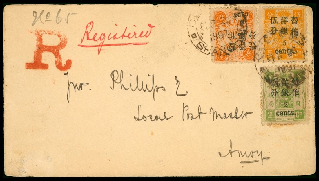 1897 (2/26) registered cover front Shanghai to Amoy. Dowager small overprint 1c,2c,5c. tied with Shanghai Custom c.d.s.