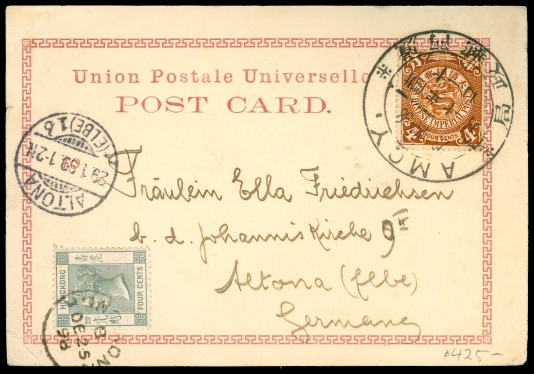 1898 Picture Post Card Amoy to Germany, 4c. coiling dragon tied with a Amoy Dollar chop (10/23), Hong Kong Q.V. 4c. with Hong Kong c.d.s. (10/25)