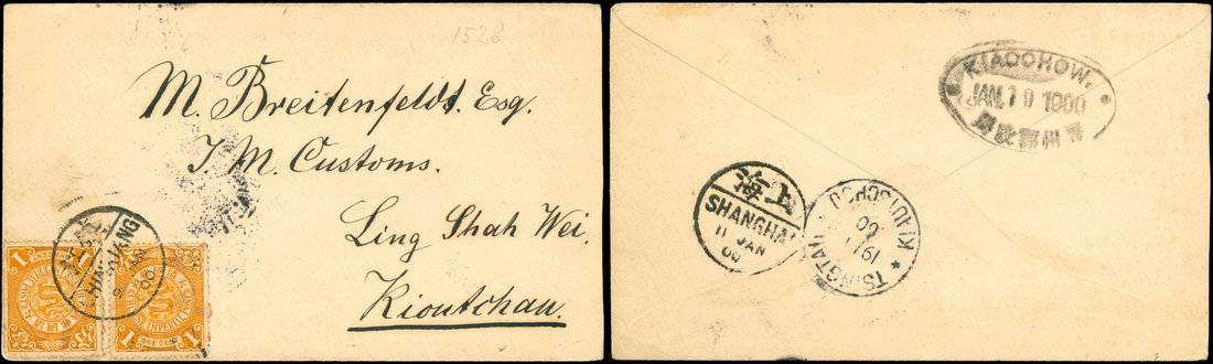 1900 (9 JAN) cover from Chinkiang to Kiaochow bearing c.d.s. Shanghai, Tsingtau trnasit and Kiaochow oval c.d.s. arrival.
