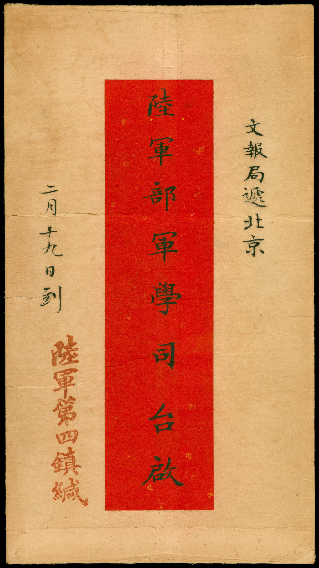 1900s red band military envelope with Peking WenBao Bureau delivery chop.
